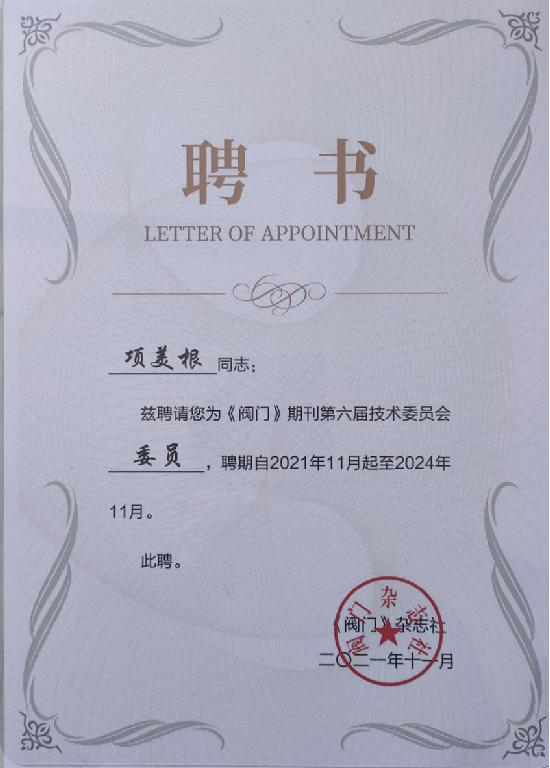 2021年11月26日,閥門期刊第六屆技術(shù)委員會(huì)換屆會(huì)議暨第一次工作會(huì)議在上海嘉定希爾頓逸林酒店召開。項(xiàng)美根終身名譽(yù)董事長應(yīng)邀出席,并被誠摯邀請項(xiàng)美根同志擔(dān)任本刊第六屆技術(shù)委員會(huì)委員。