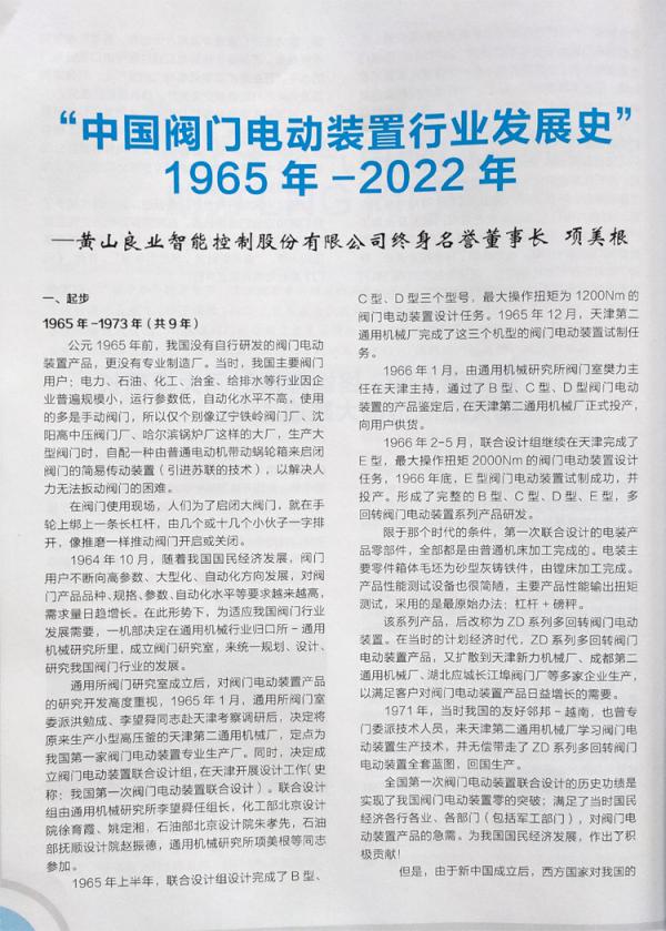 文章詳情由黃山良業(yè)項(xiàng)美根名譽(yù)董事長(zhǎng)撰寫(xiě)的論文《中國(guó)閥門(mén)電動(dòng)裝置行業(yè)發(fā)展史——1965-2021》繼2021年2月、4月在《閥門(mén)用戶(hù)》發(fā)表后,在業(yè)內(nèi)產(chǎn)生強(qiáng)烈的反響。之后《中國(guó)通用機(jī)械》雜志也選用該論文,并連續(xù)刊登在2021年12月第6期,2022年第1、2期上。近日又被《閥門(mén)》雜志社選用刊登在《閥門(mén)》雜志2022年第3期上,讓更多的讀者了解我國(guó)閥門(mén)電裝的發(fā)展歷程,并提供豐富的珍貴歷史資料。