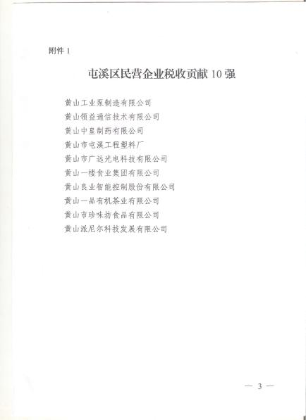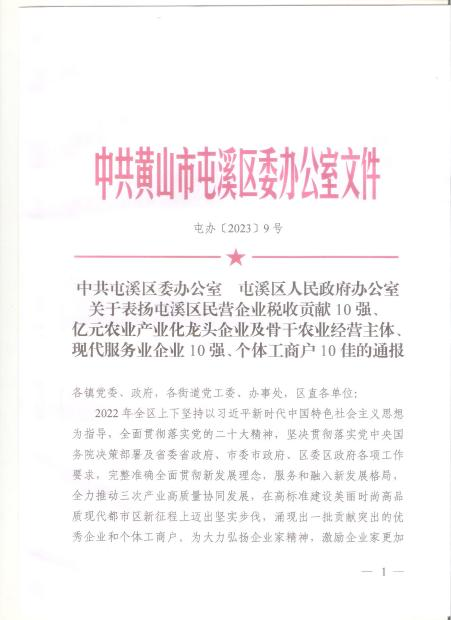 2023年2月1日中共黃山市區(qū)委區(qū)政府公布了《關(guān)于表揚(yáng)屯溪區(qū)民營企業(yè)稅收貢獻(xiàn)10強(qiáng)、億元農(nóng)業(yè)產(chǎn)業(yè)化龍頭企業(yè)及骨干農(nóng)業(yè)經(jīng)營主體、現(xiàn)代代服務(wù)業(yè)企業(yè)10強(qiáng)、個(gè)體工商戶10佳的通報(bào)》(屯辦[2003]9號),我公司榮獲屯溪區(qū)民營企業(yè)稅收貢獻(xiàn)10強(qiáng)之一。