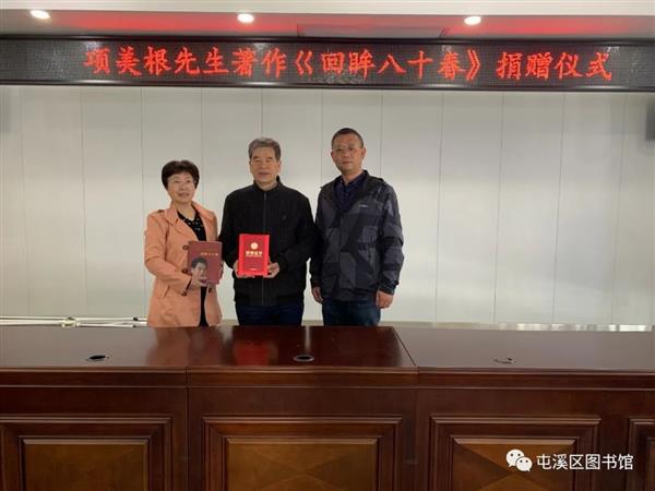 文章詳情4月26日上午,項(xiàng)美根先生捐書儀式在屯溪區(qū)圖書館六樓會(huì)議室舉行。項(xiàng)美根先生此次捐贈(zèng)給我館的是他的個(gè)人作品《回眸八十春》。屯溪區(qū)圖書館館長(zhǎng)胡煒接收了圖書饋贈(zèng),副館長(zhǎng)王鵬為項(xiàng)老頒發(fā)捐書證書。