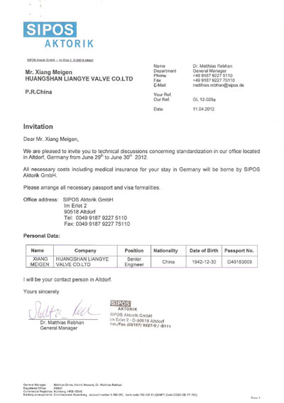 【導(dǎo)讀】黃山良業(yè)閥門有限公司董事長項美根應(yīng)邀出席德國柏林召開的國際閥門標(biāo)準(zhǔn)化會議,目前已收到din標(biāo)準(zhǔn)化組織發(fā)來的邀請函(valvesstandardscommittee)。黃山良業(yè)閥門有限公司是國內(nèi)著名的閥門電動裝置生產(chǎn)企業(yè),由我國第…
