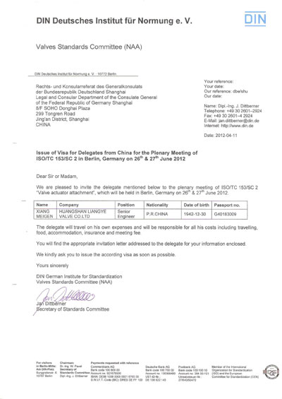 項美根董事長將應(yīng)邀出席德國柏林召開的國際閥門標(biāo)準(zhǔn)化會議